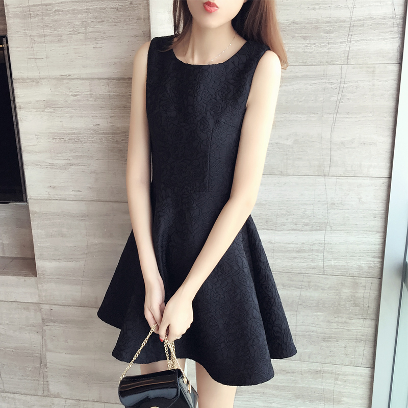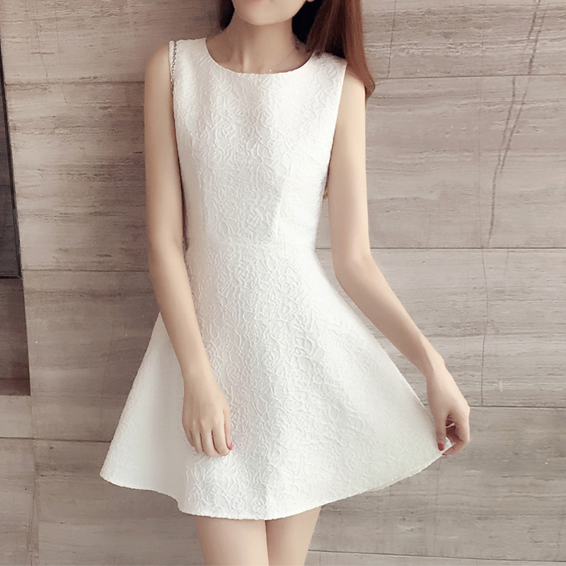 纯色印花气质连衣裙显瘦收腰无袖背心A字裙子