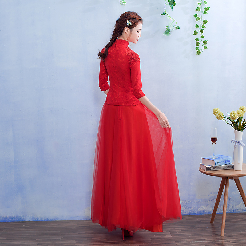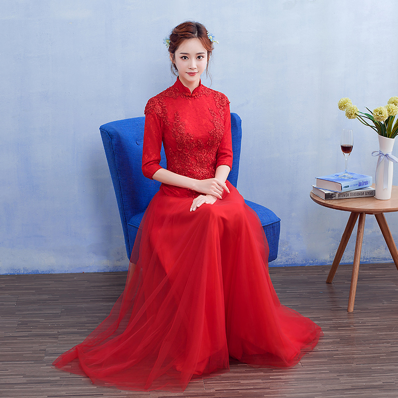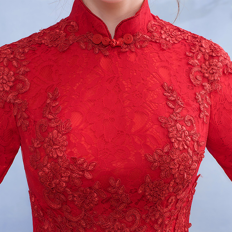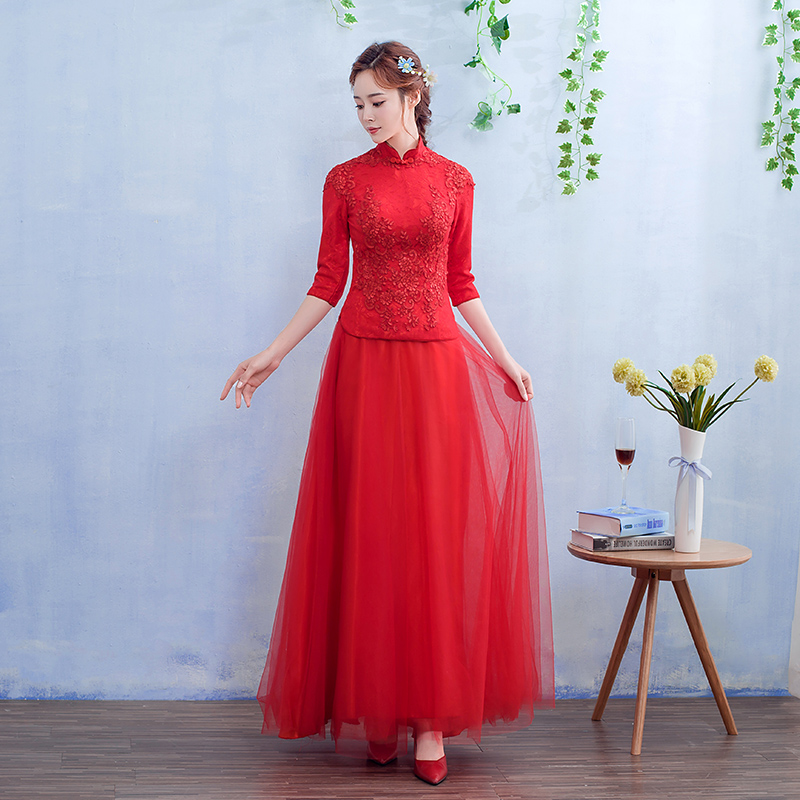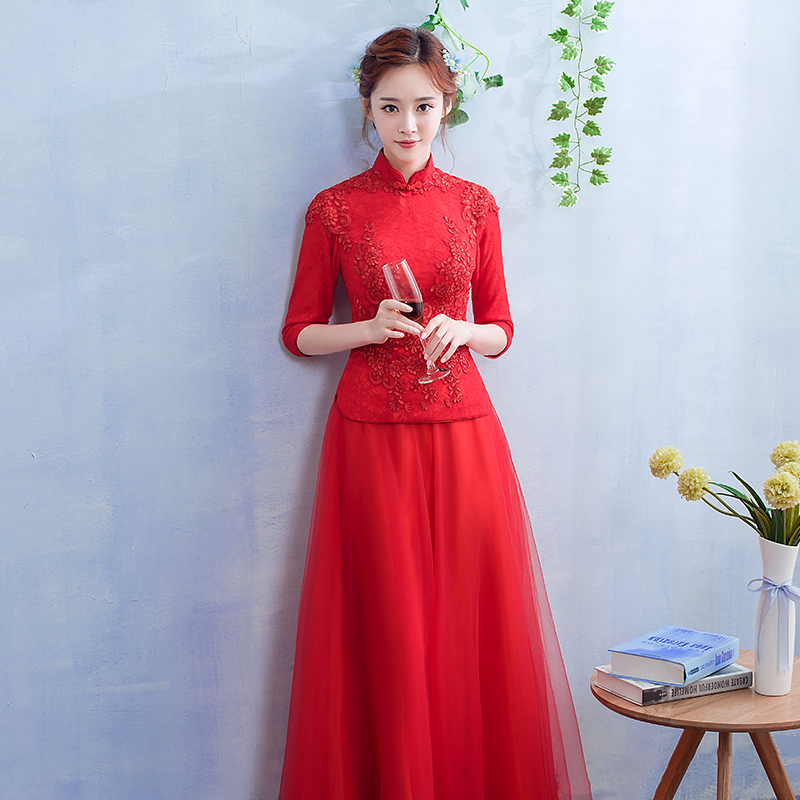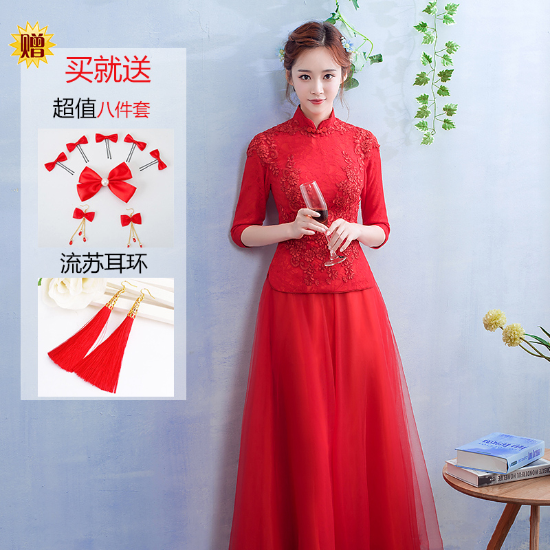 • 2017新款敬酒服新娘春季结婚礼服长款红色中式婚礼修身甜美回