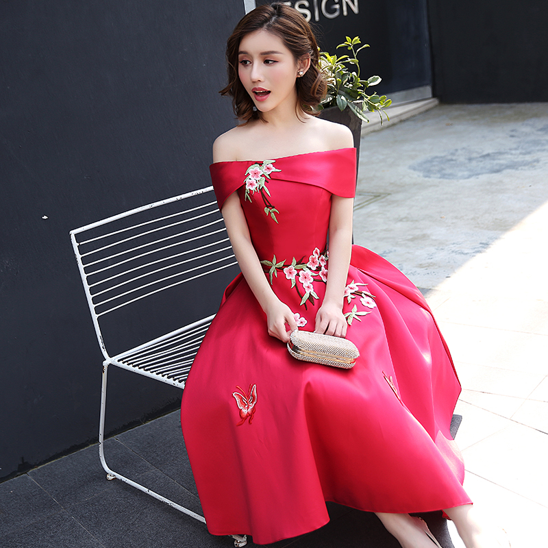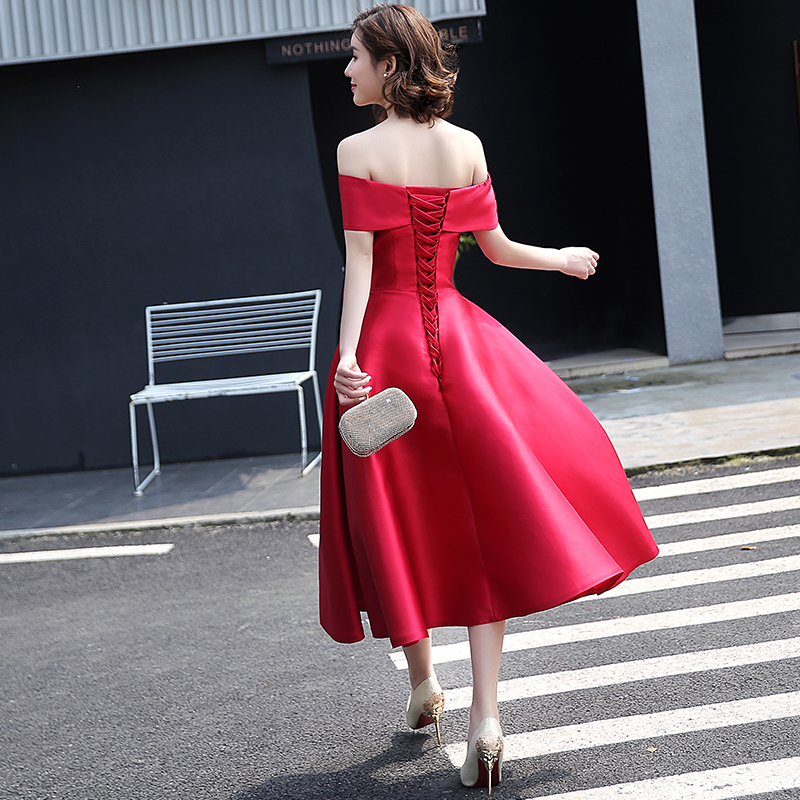 • 新款新娘结婚敬酒回门服!时尚中长款一字肩韩版红色修身晚礼服