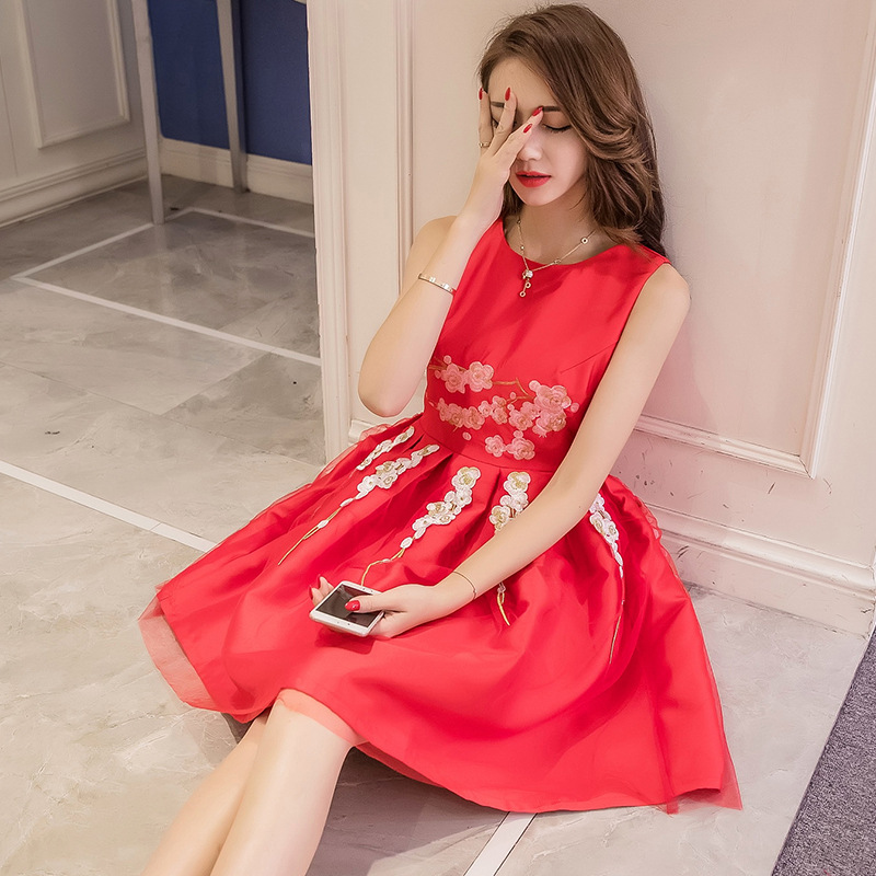 • 2017夏季新款女装网纱刺绣红色连衣裙孕妇显瘦无袖蓬蓬裙气质