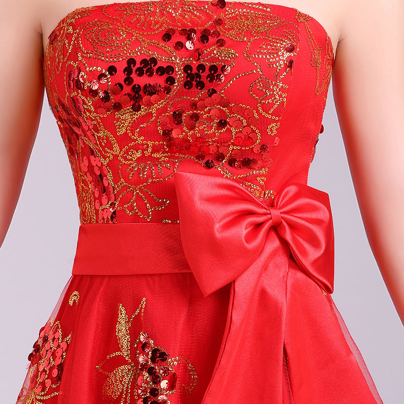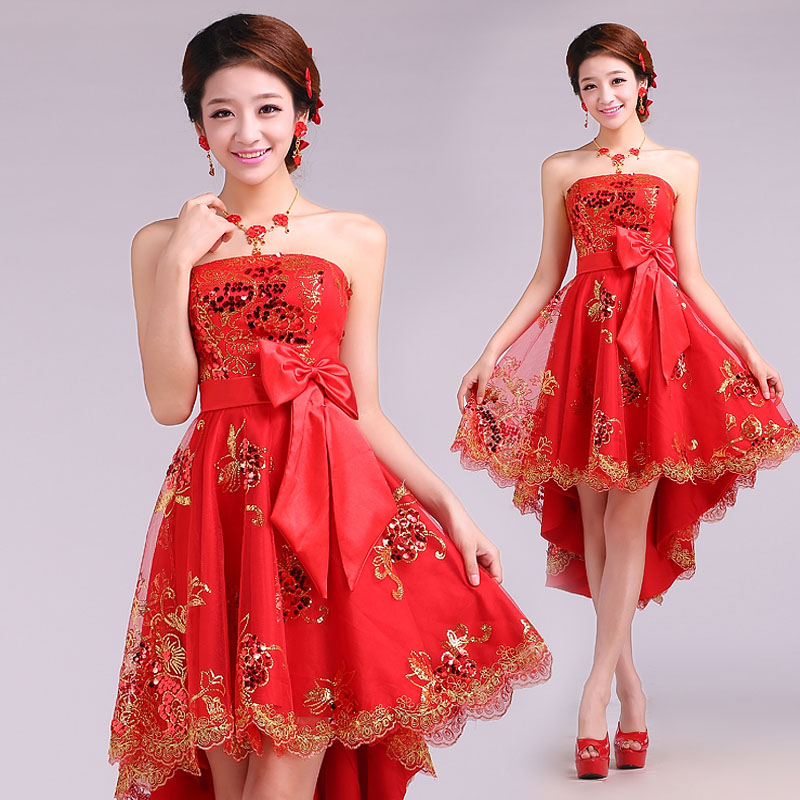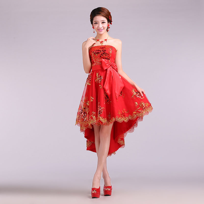 • 时尚改良新娘旗袍裙 韩版抹胸绑带前短后长款礼服裙 真丝刺绣女