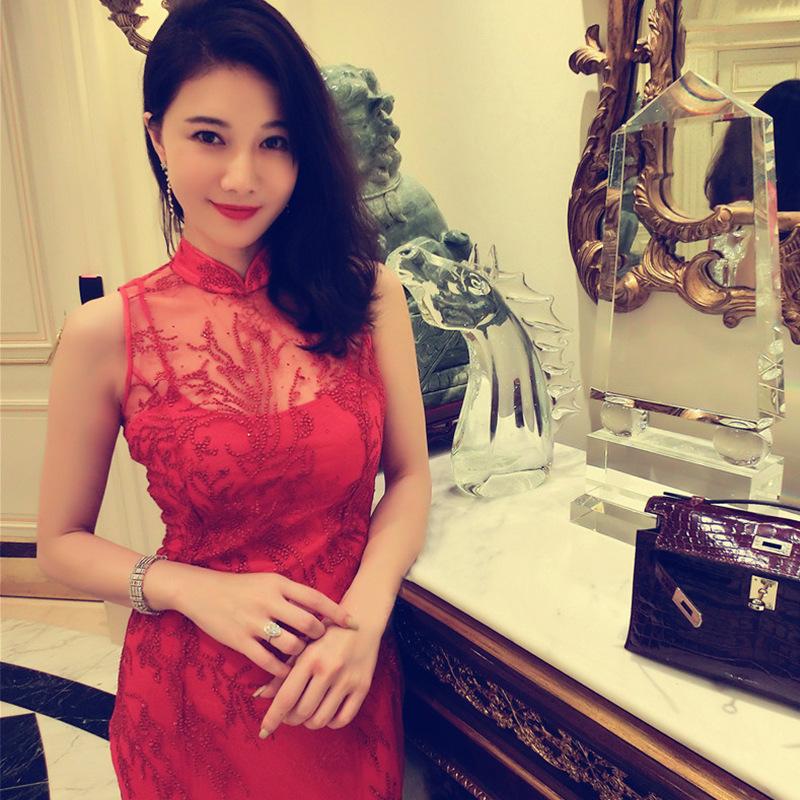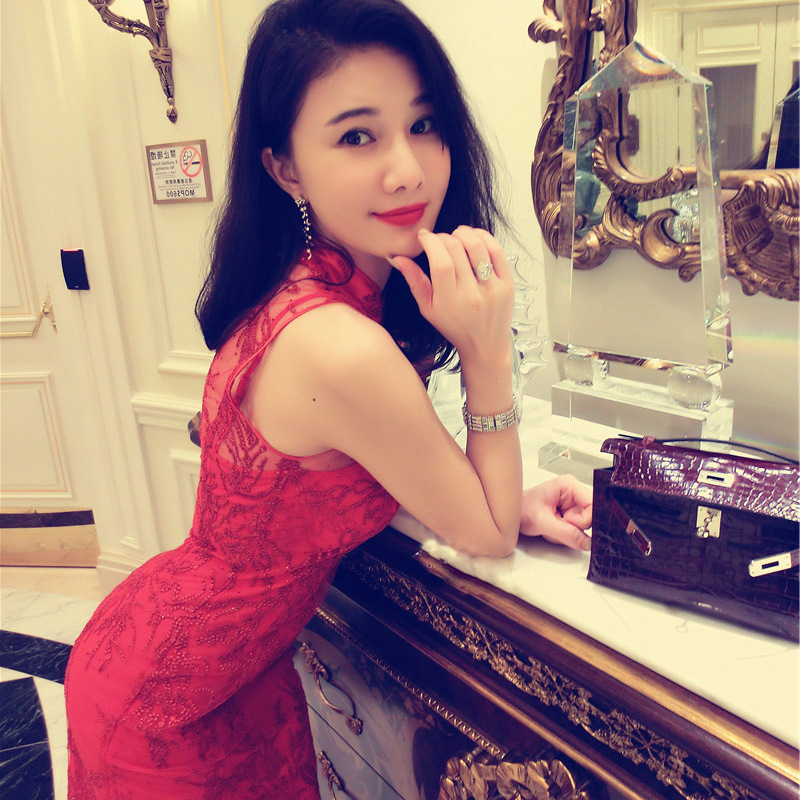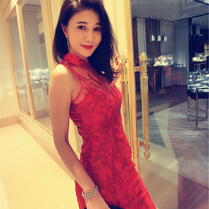 新娘结婚礼服新款刘钰懿刘美人同款红色水钻蕾丝修身晚礼服