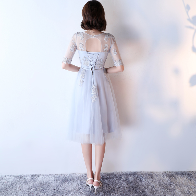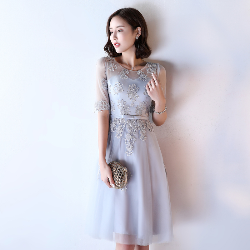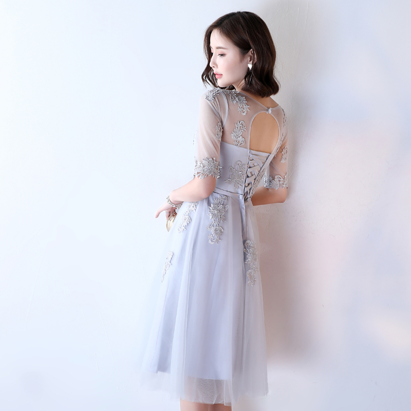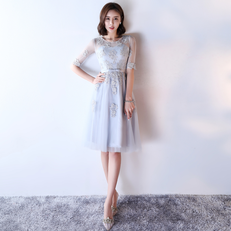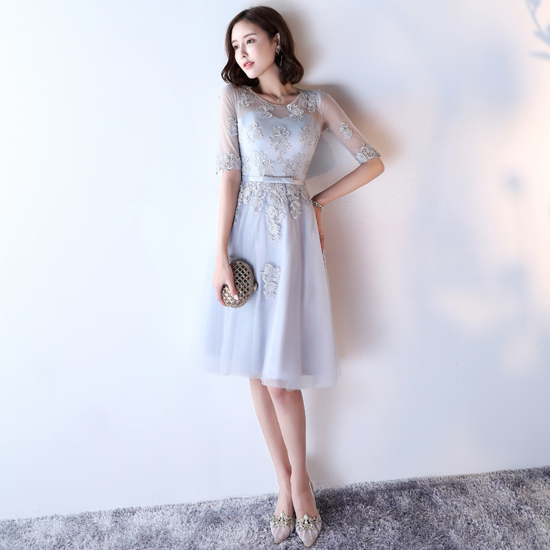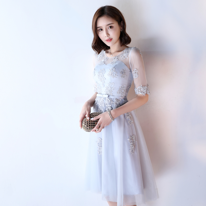 • 【送项链耳环】伴娘服姐妹裙灰色圆领时尚2017新娘宴会晚礼服