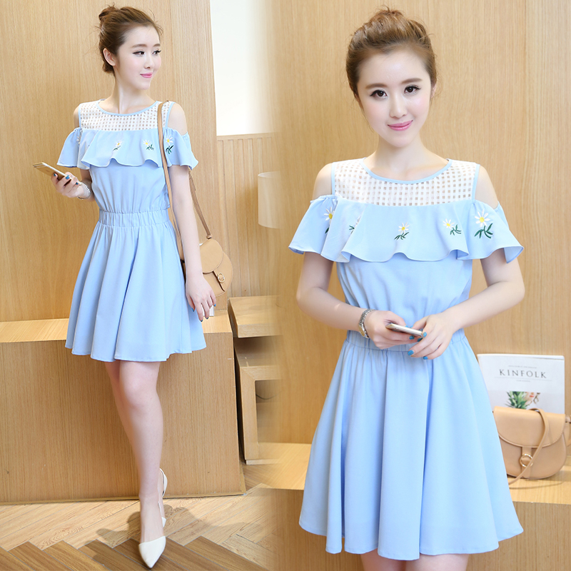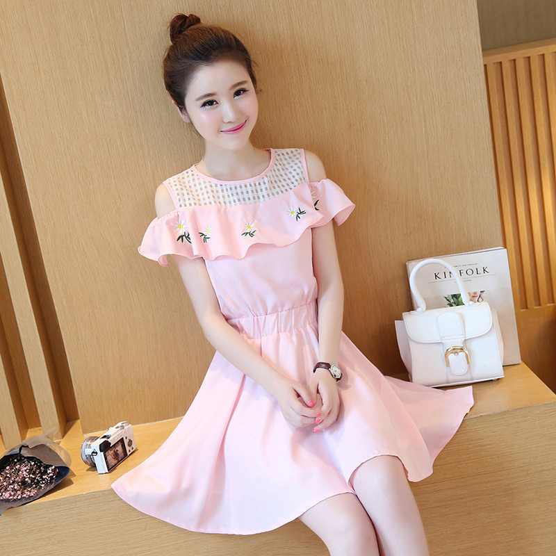 2017新款韩版女装短袖裙子镂空露肩甜美小清新绣花A字裙连衣