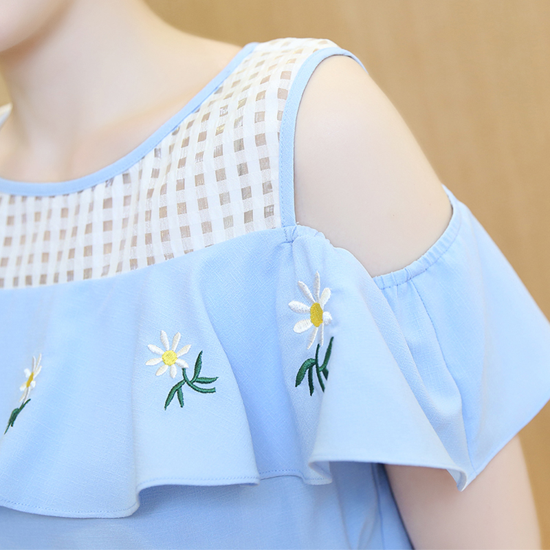 • 2017新款韩版女装短袖裙子镂空露肩甜美小清新绣花A字裙连衣