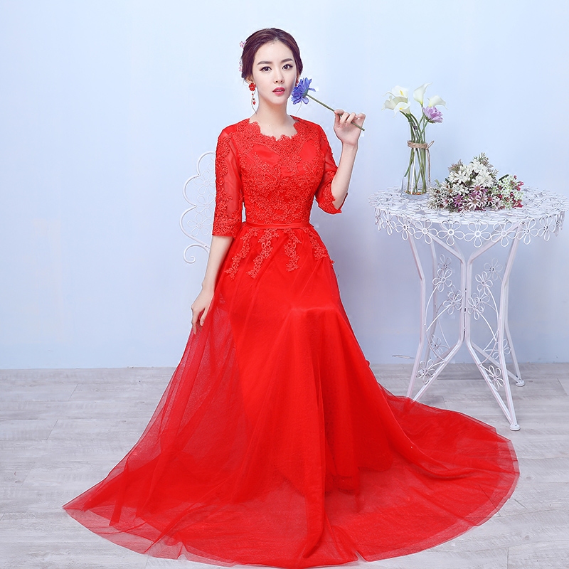 敬酒服新娘春夏礼服裙显瘦中袖长款红色蕾丝宴会晚礼服2017新