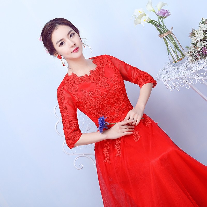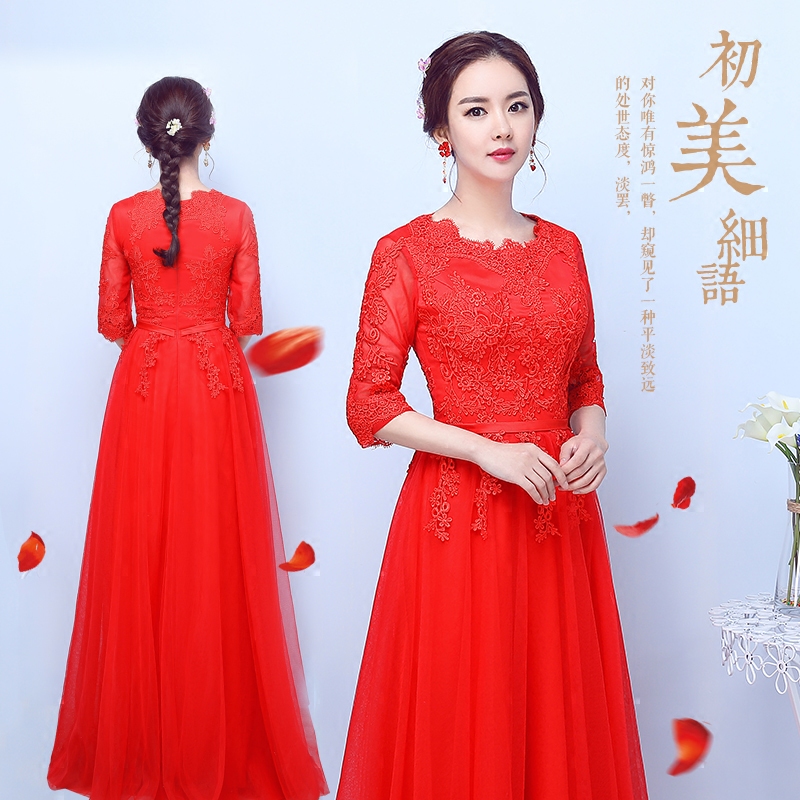 • 敬酒服新娘春夏礼服裙显瘦中袖长款红色蕾丝宴会晚礼服2017新