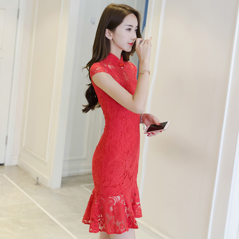 • 旗袍中式晚礼服女装时尚订婚敬酒服新娘回门装显瘦短款蕾丝连衣裙