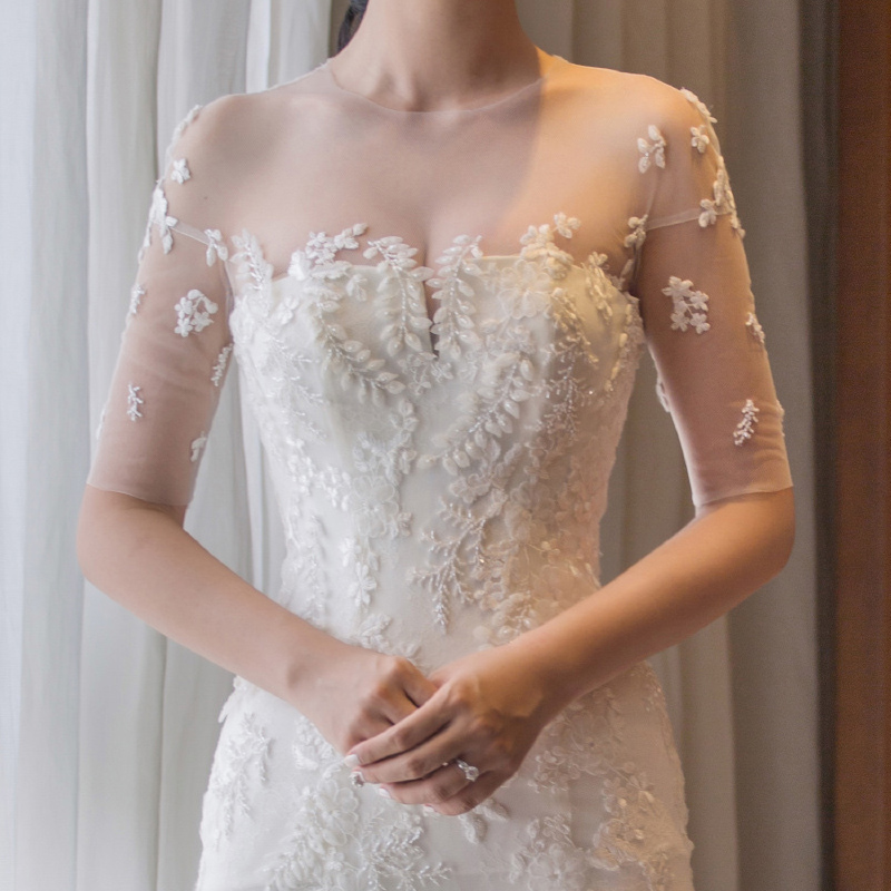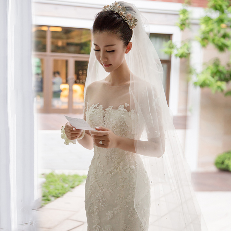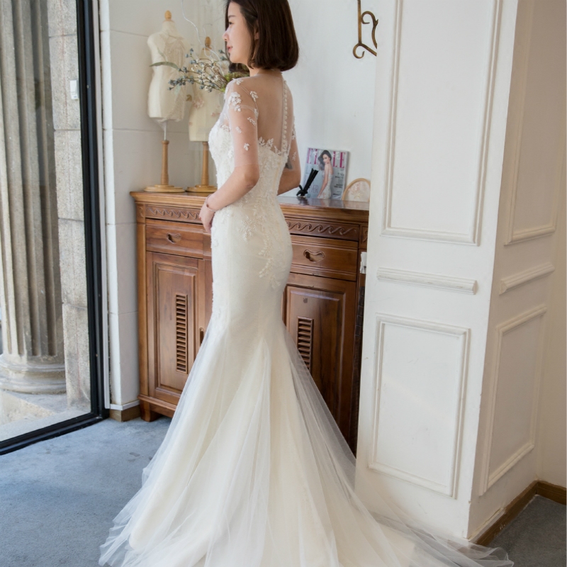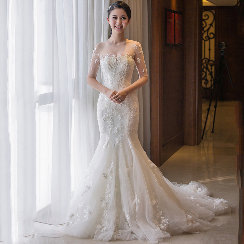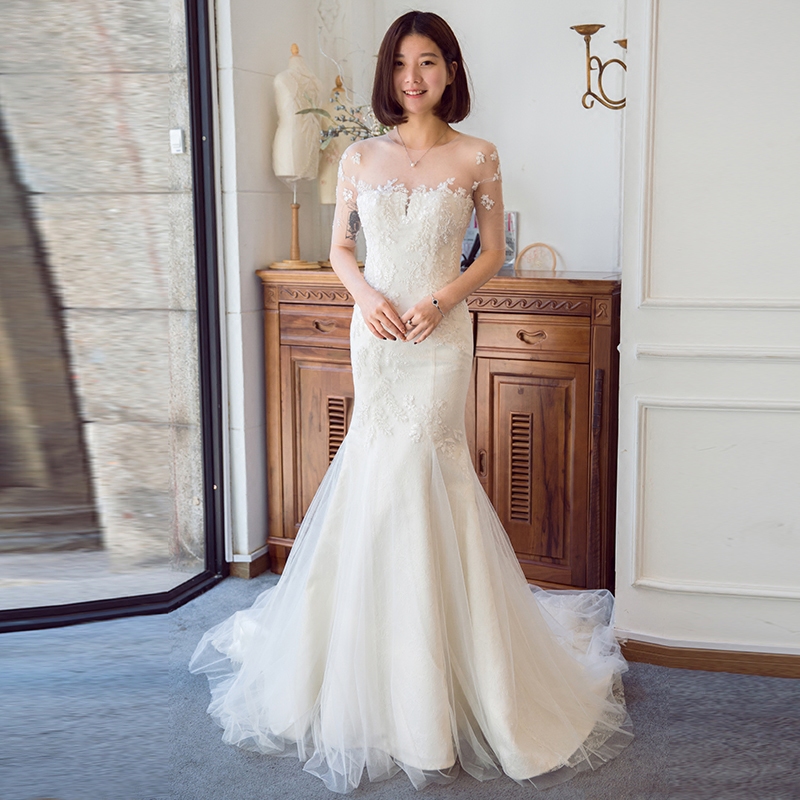 • 轻婚纱礼服2017新款新娘一字肩收腰鱼尾小拖尾韩式个性森系夏