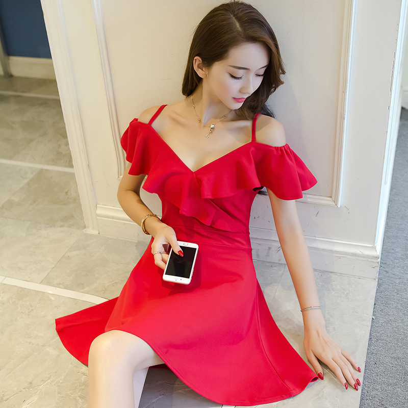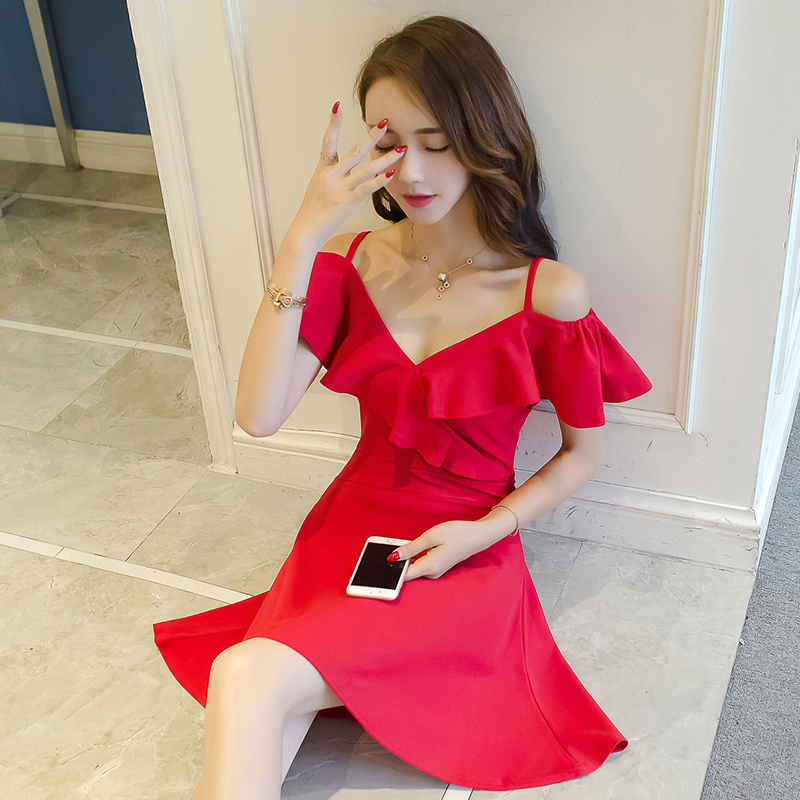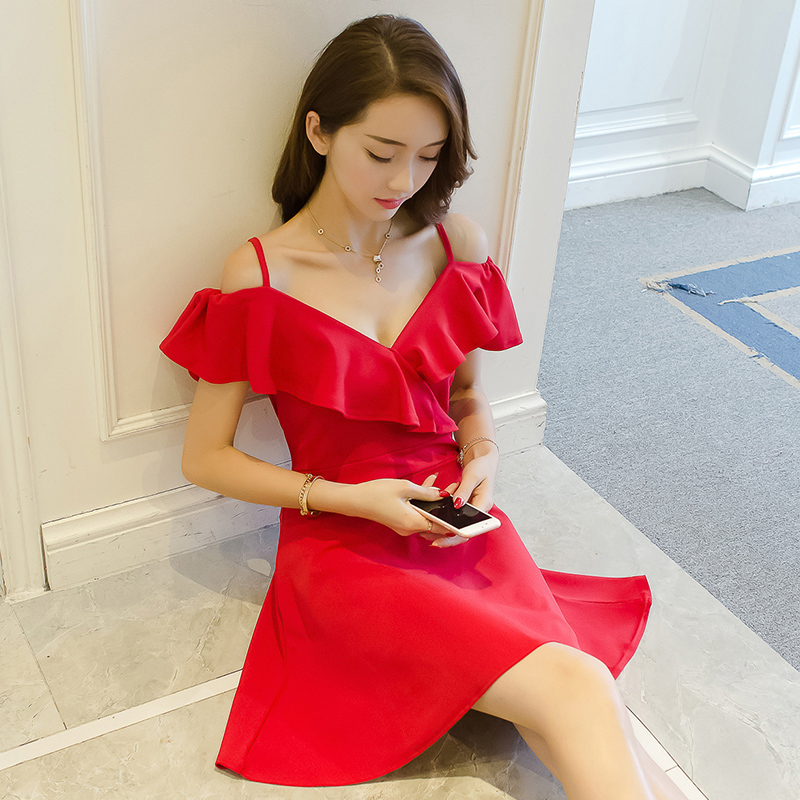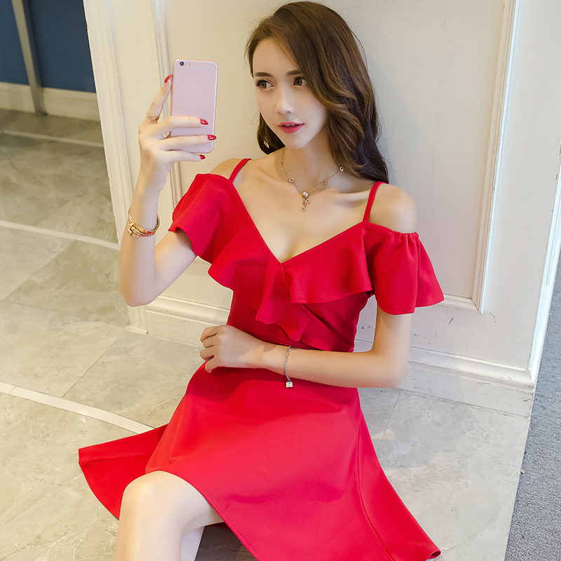 • 新款裙气质港味裙子女夏修身V领露肩吊带A字裙