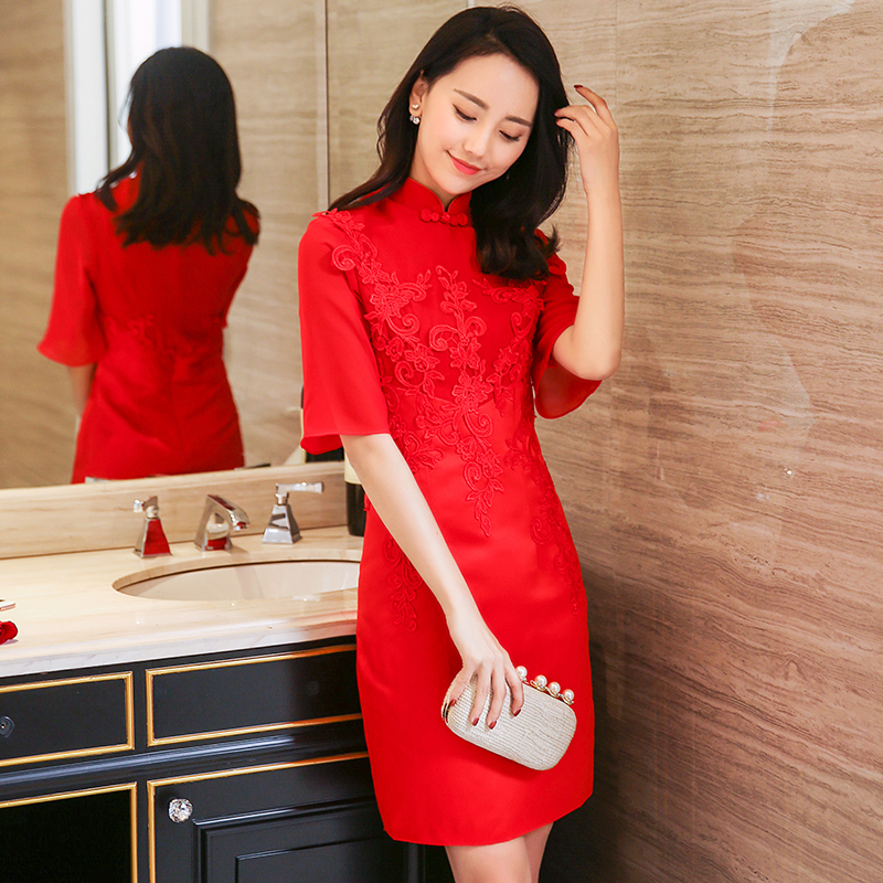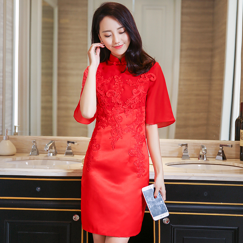 红色时尚!新款时尚新娘敬酒服旗袍结婚礼服红色修身中袖回门服