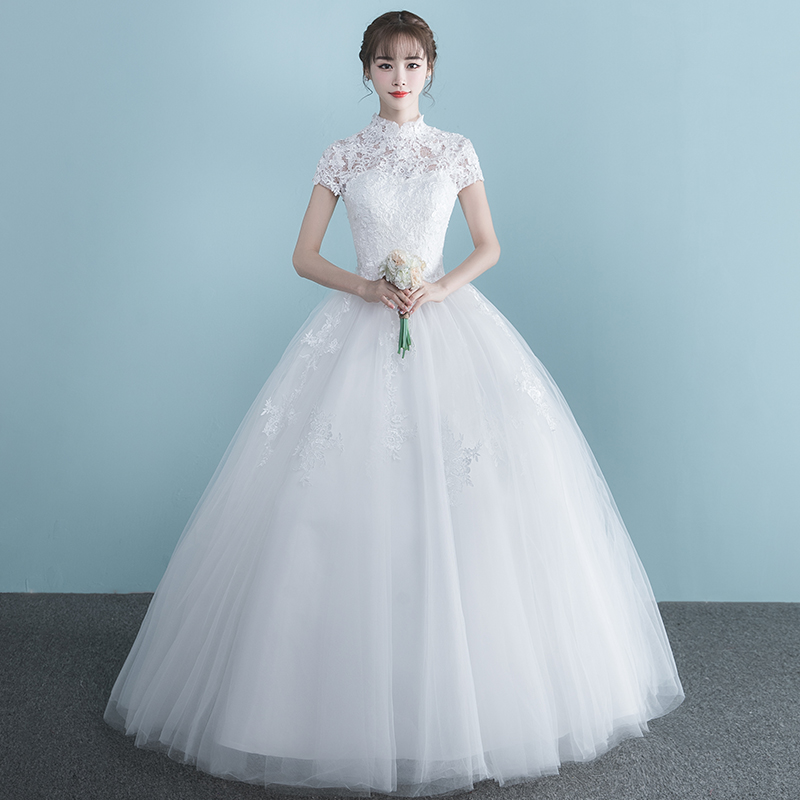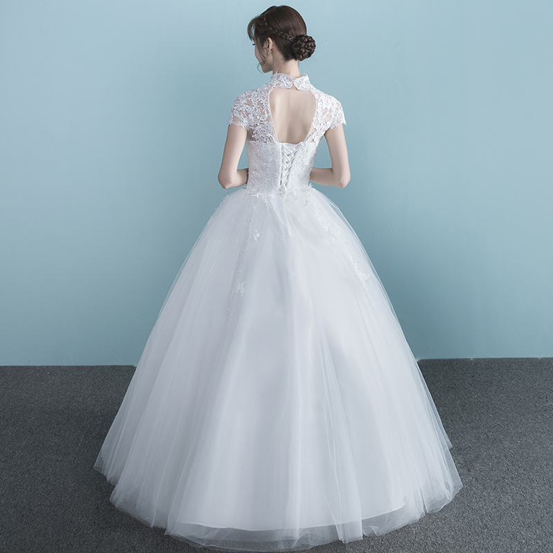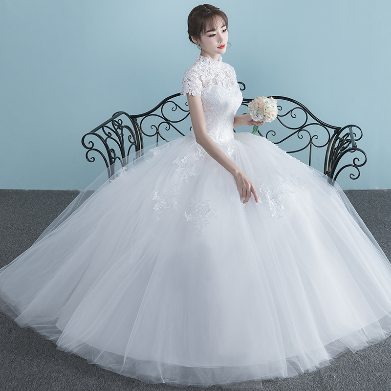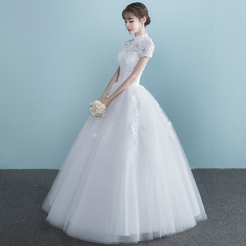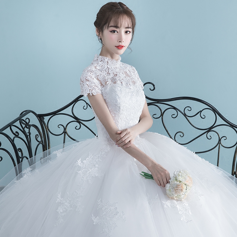 • 婚纱礼服2017新款夏季一字肩短袖婚纱齐地大码简约公主长拖尾