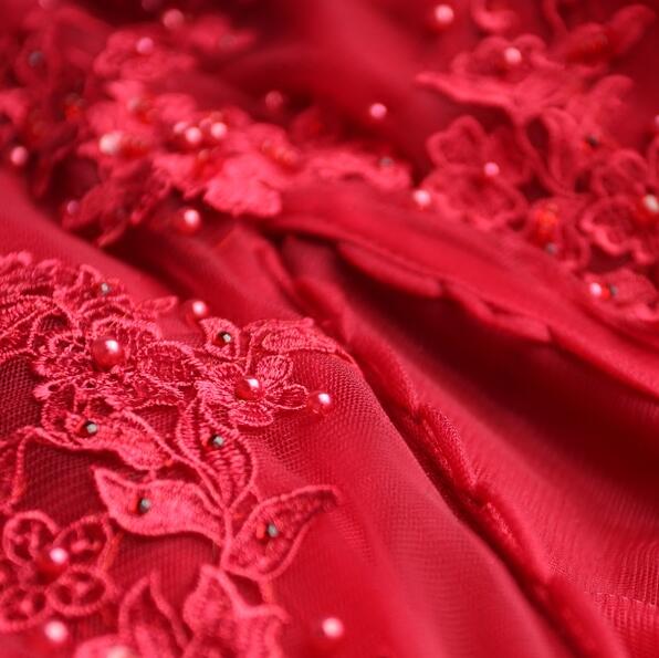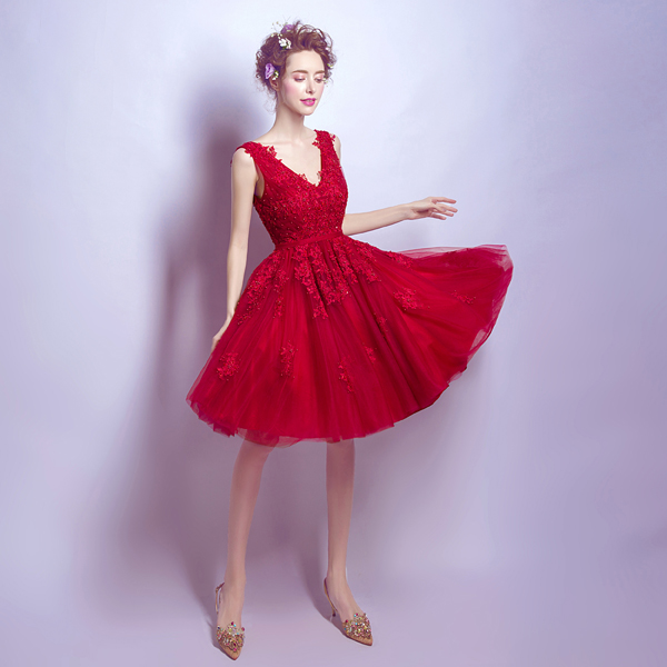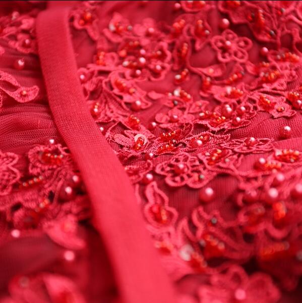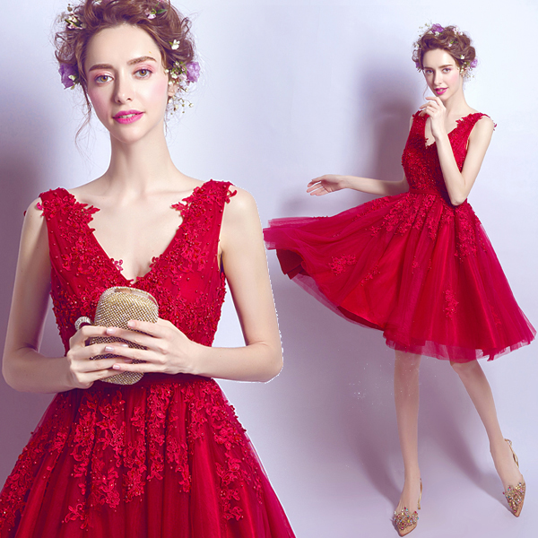 • 红色蕾丝深v领短款新娘婚纱小礼服结婚敬酒服