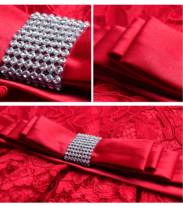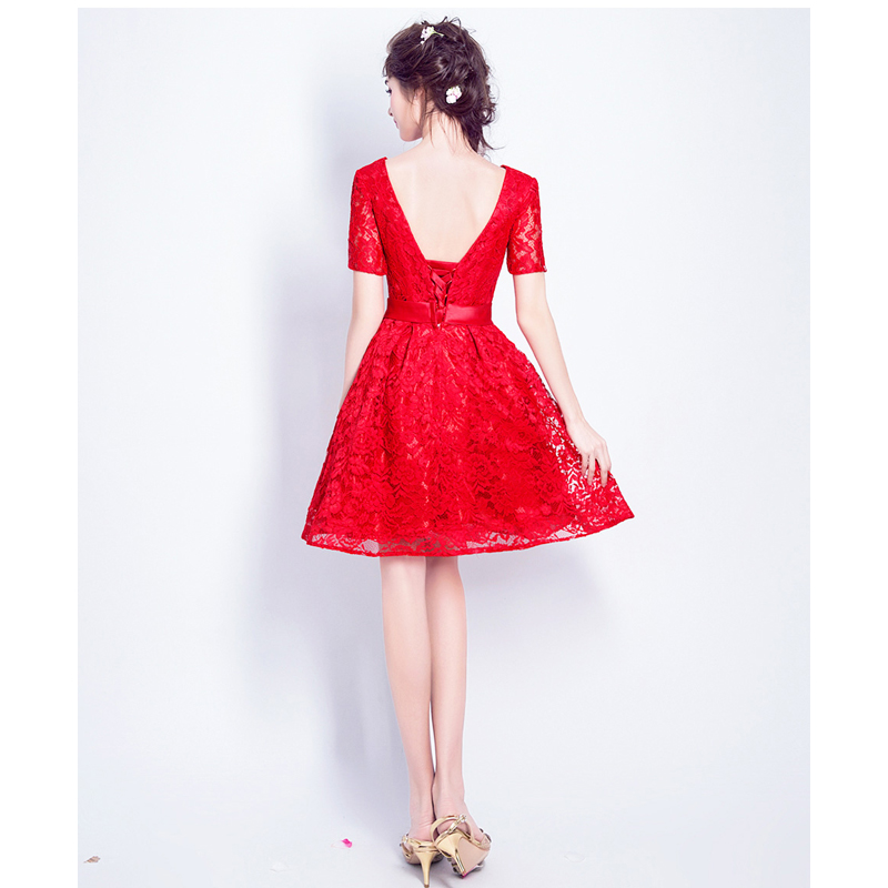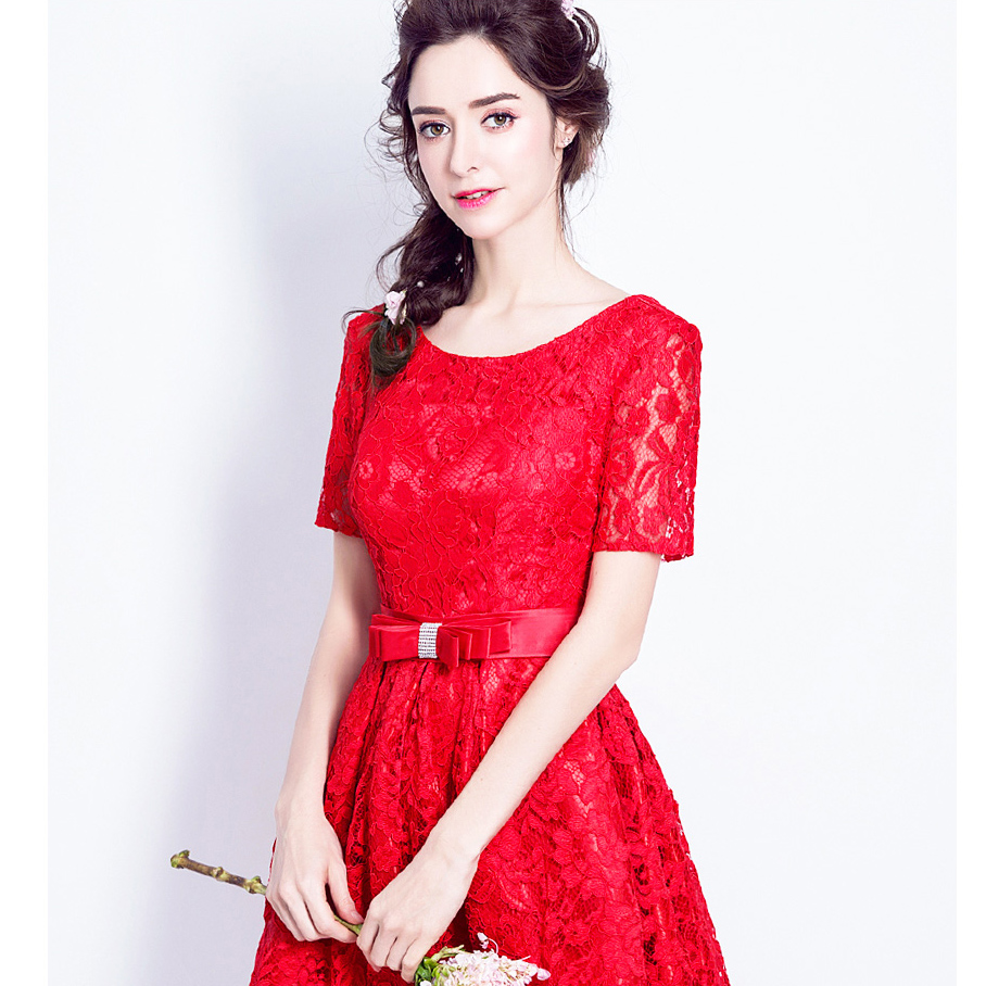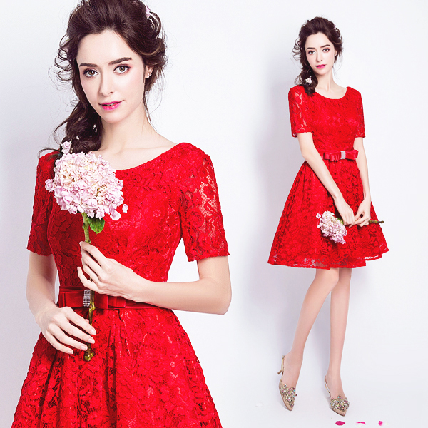 •  红色蕾丝短袖新娘结婚敬酒服甜美婚纱小礼服