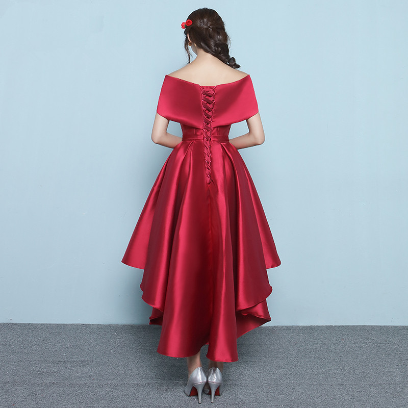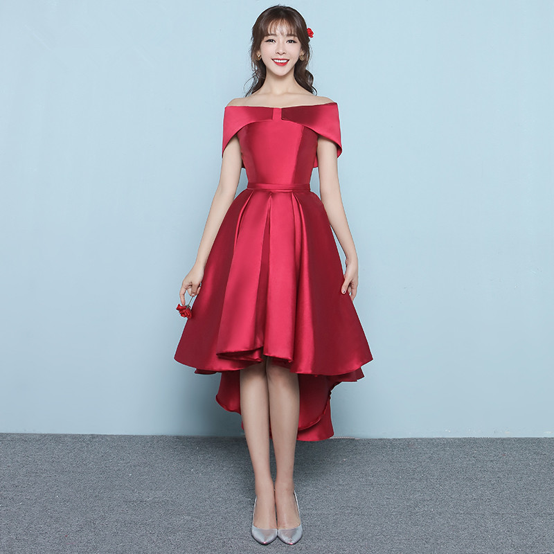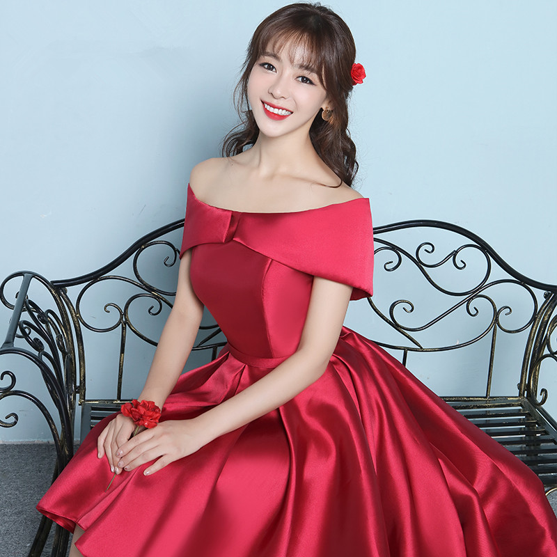 • 一字肩礼服短款春季中长款前短后长修身酒红色回门服晚礼服女韩版