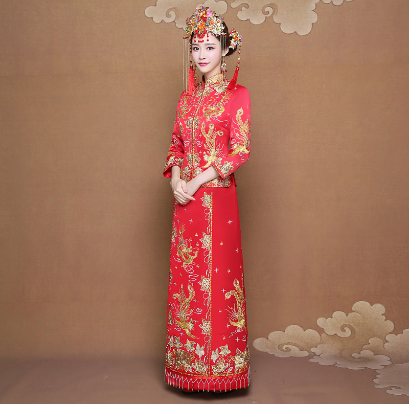 • 2017新款春夏长款中式敬酒服秀禾服龙凤褂红色女结婚