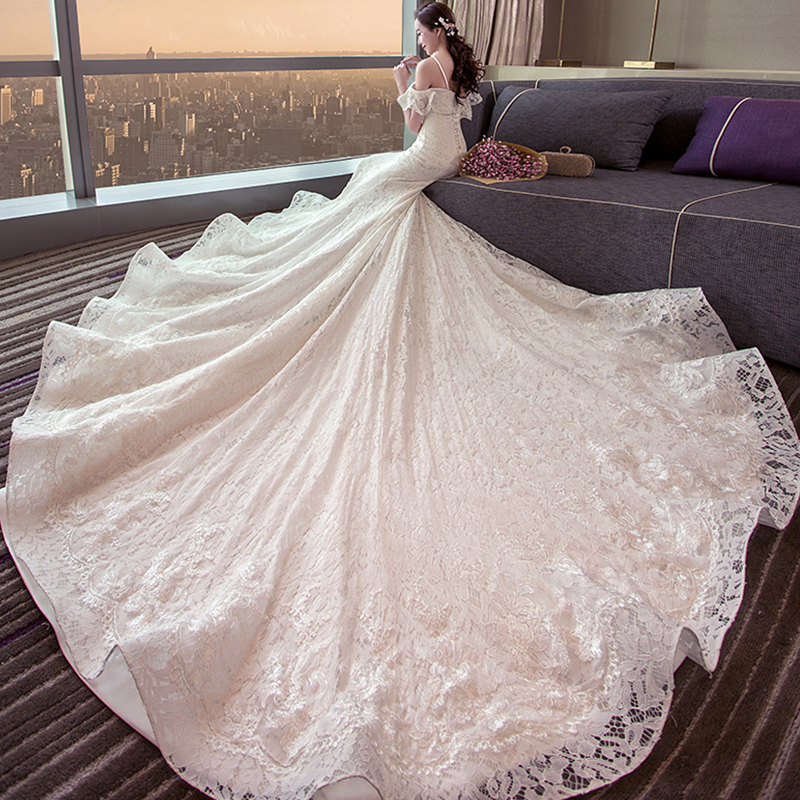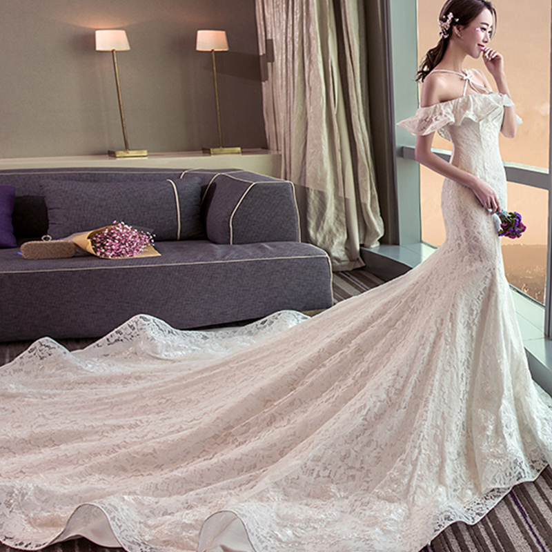 2017新款一字肩大拖尾欧美长拖尾礼服新娘鱼尾公主婚纱206