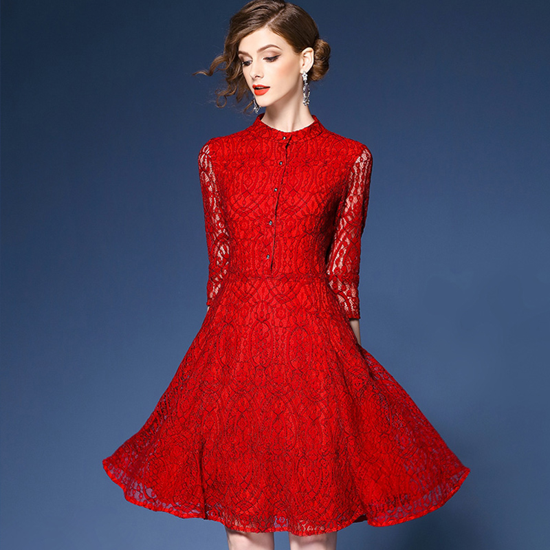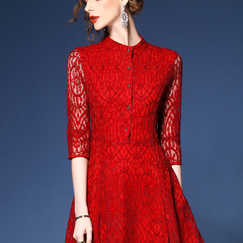 • 2017春装 新款女装修身大码打底红色蕾丝连衣裙452