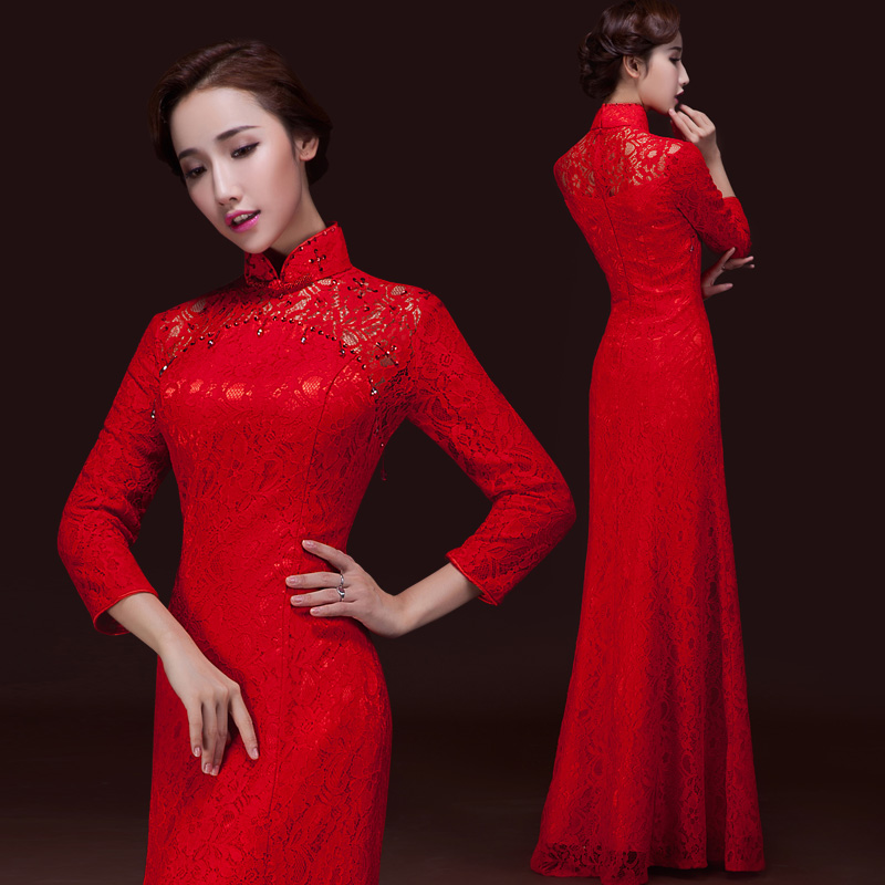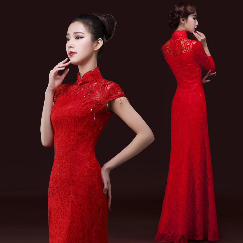 • 敬酒服新娘红色旗袍长款鱼尾蕾丝中式结婚礼服修身迎宾礼仪晚礼服