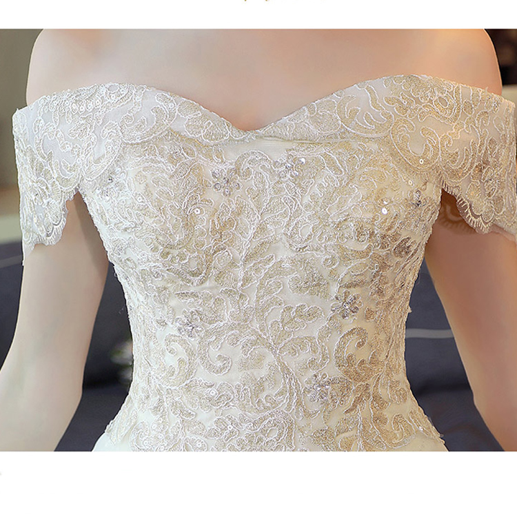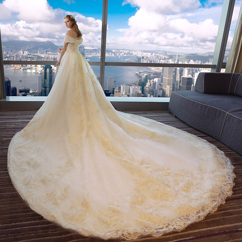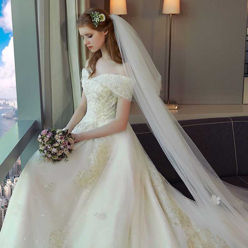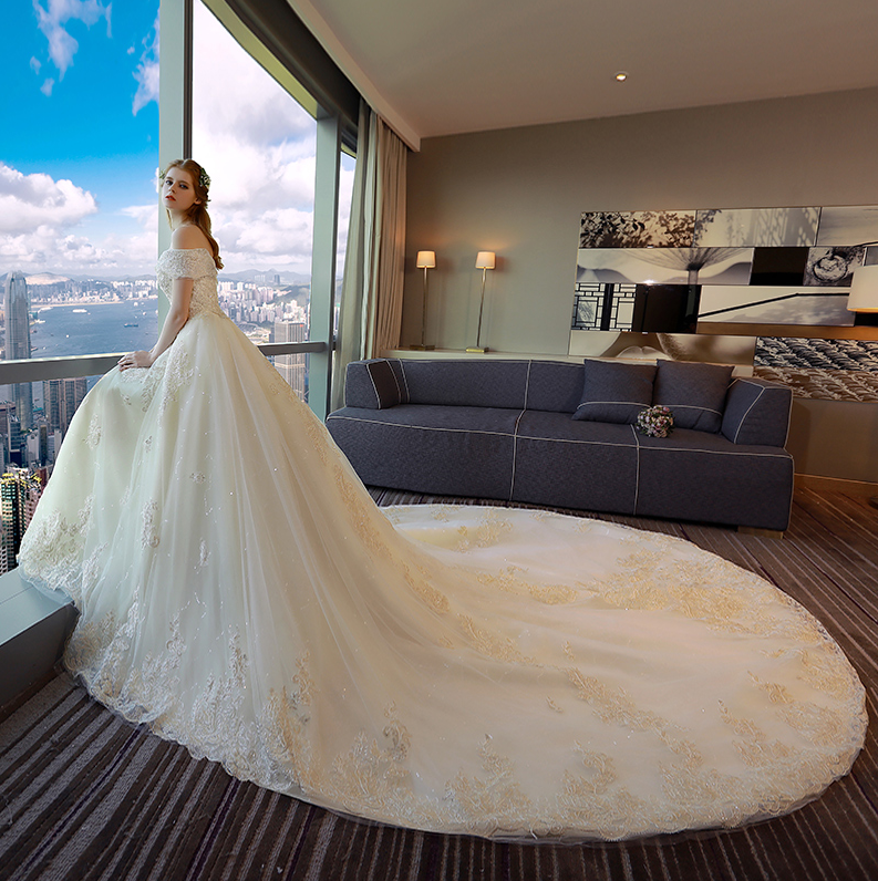 • 长拖尾婚纱礼服新娘2017新款欧美宫廷一字肩奢华大牌森系公主