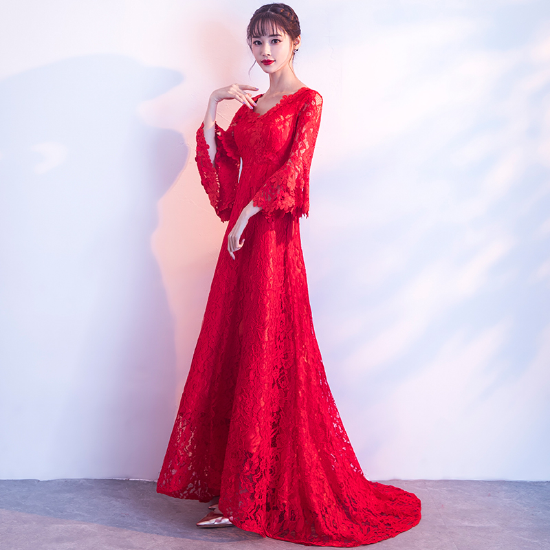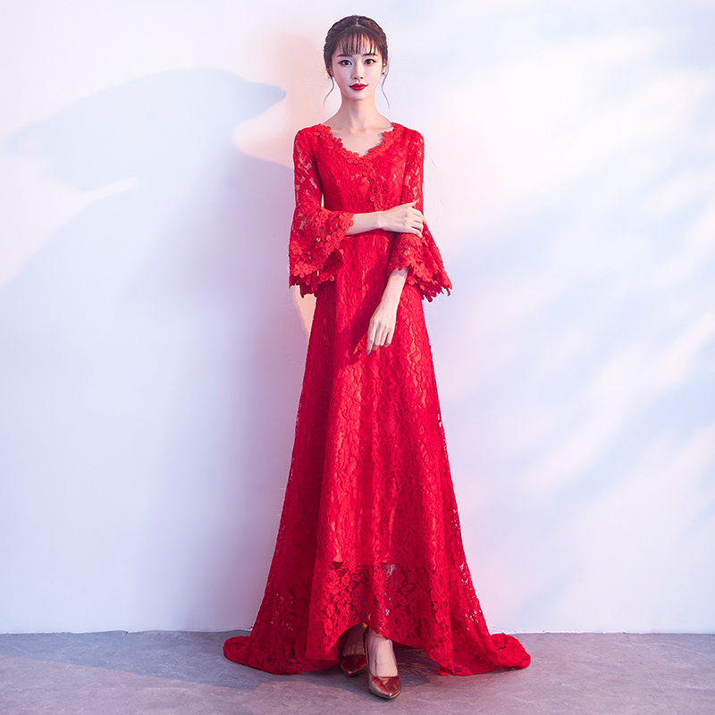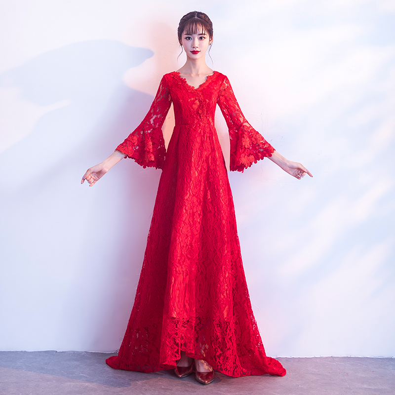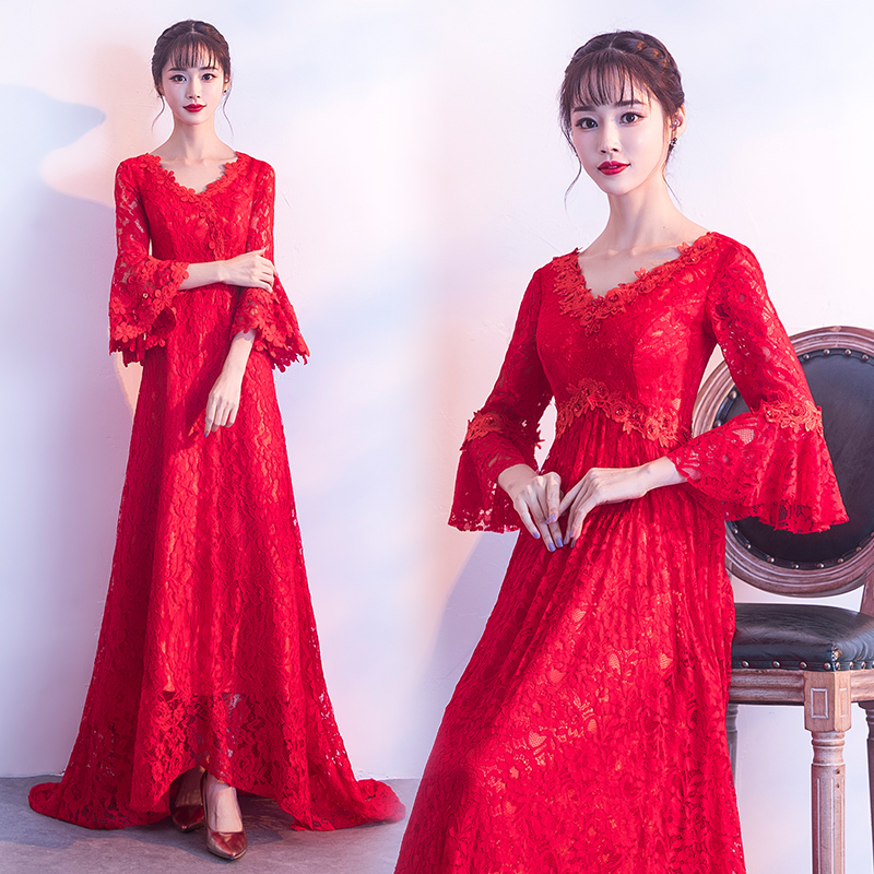 孕妇首选!高腰拖尾!v领长款新娘礼服冬季显瘦长袖结婚敬酒服