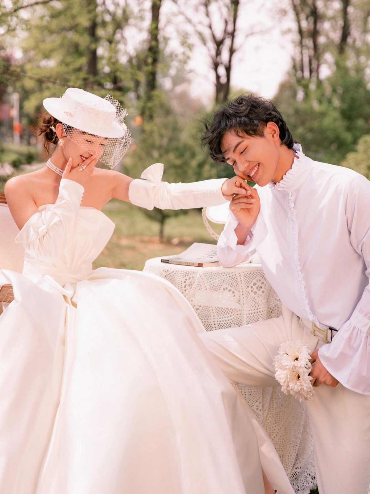 草坪粉纱法式浪漫婚纱照